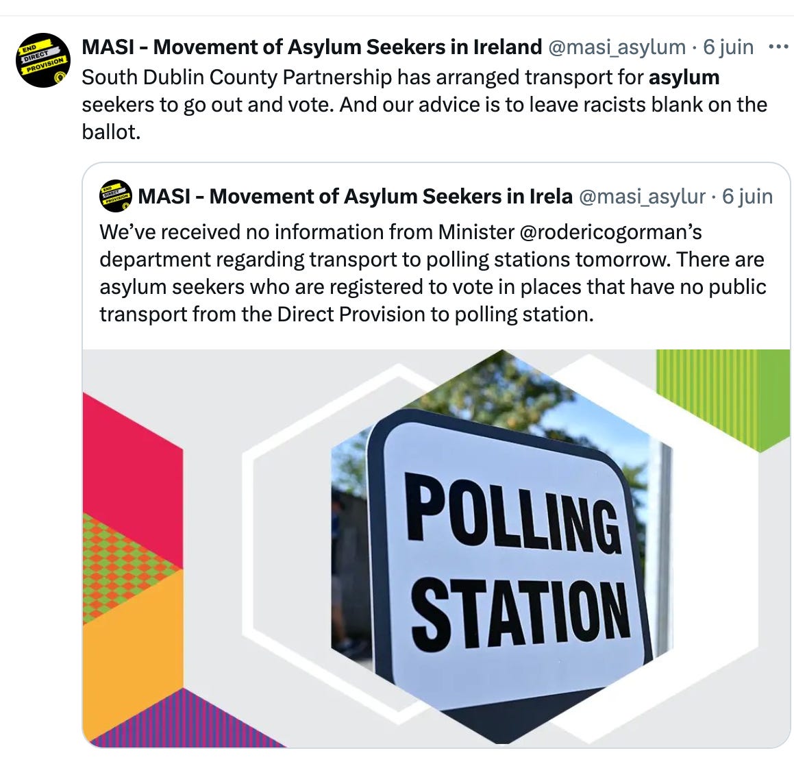 “South Dublin County Partnership has arranged transport for asylum seekers to go out and vote. And our advice is to leave racists blank on the ballot”.